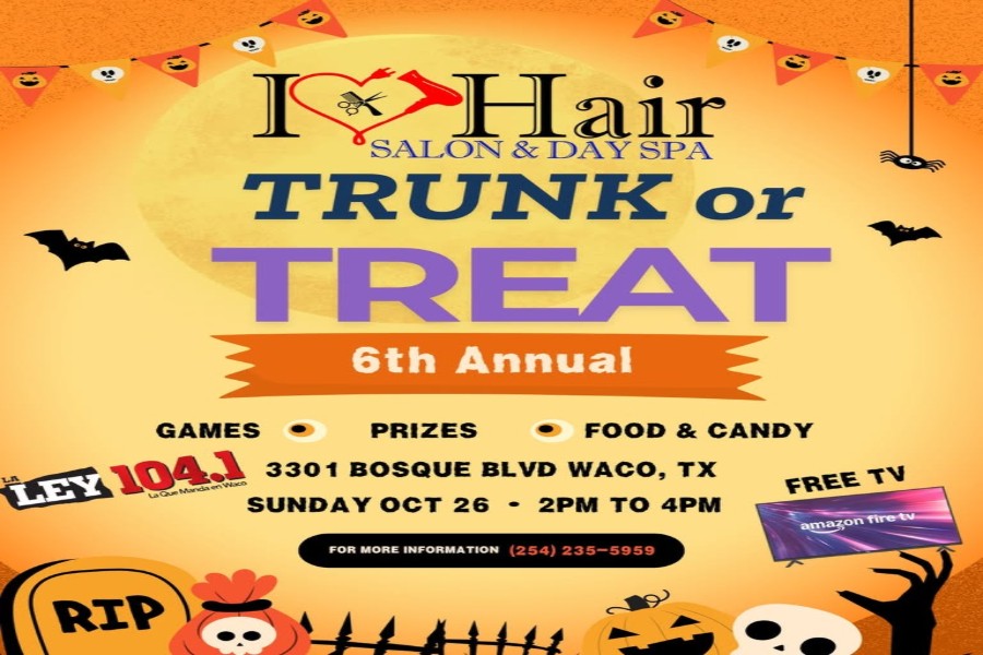 Home W A C O E V E N T S - Visit Waco, TX 6th Annual Trunk or Treat Organizer I Heart Hair Salon Location 3301 Bosque BoulevardWaco, TX, 76707United States Category CommunityFamily FriendlyFree Date Oct 26 2025 Expired! Time 2:00 pm - 4:00 pm 6th Annual Trunk or Treat It’s that time of year! Join I Heart Hair Salon Share this event