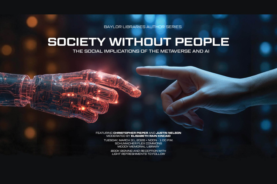 On Tuesday, March 31, 2026, at Noon CST, the Baylor Libraries Author Series will feature Dr. Christopher Pieper and Dr. Justin Nelson in conversation with Dr. Elisabeth Rain Kincaid about their recently released book, “Society Without People: The Social Implications of the Metaverse and AI.” This timely and engaging conversation will take place in the Schumacher Flex Commons of Moody Memorial Library on