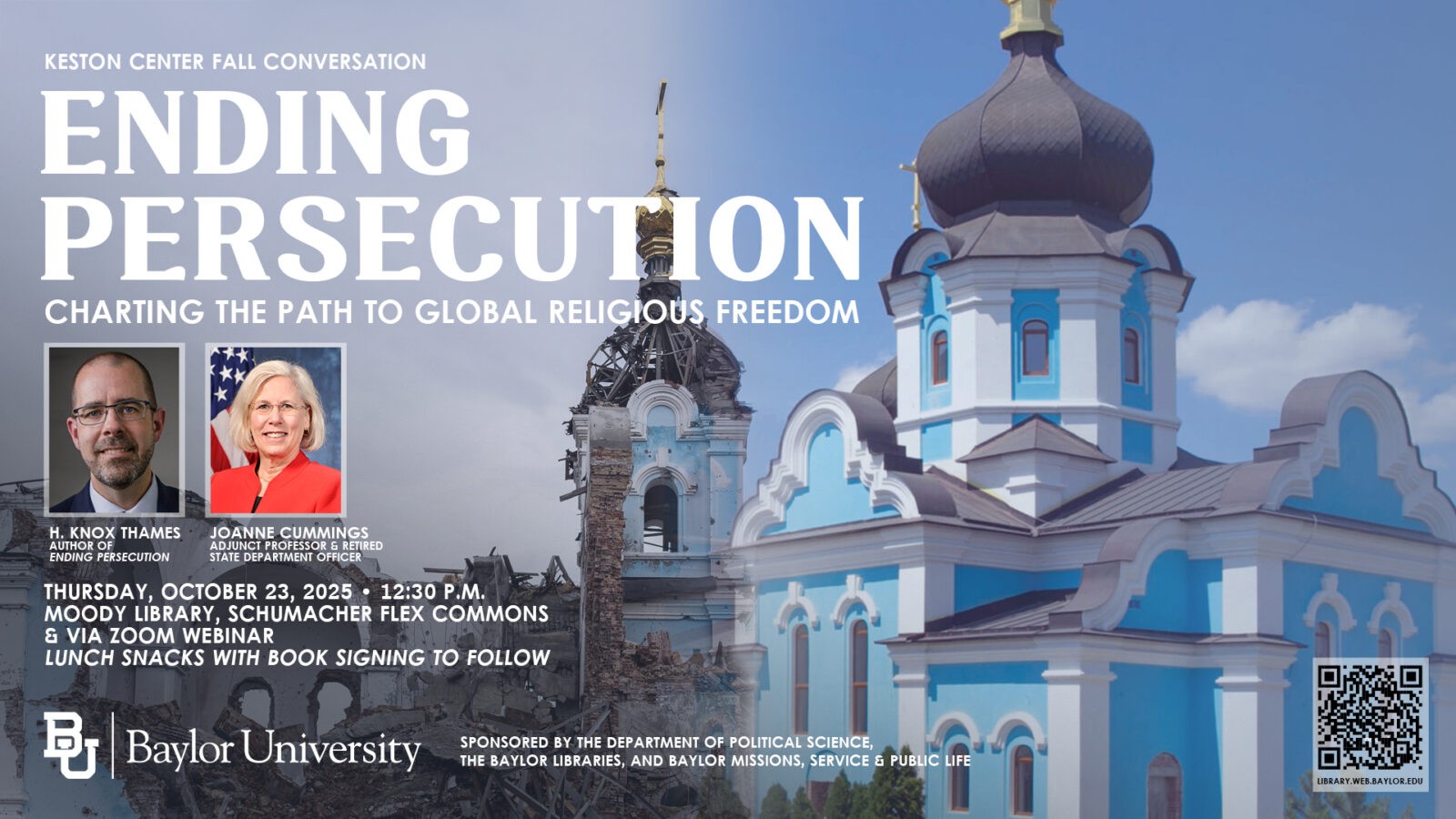 On Thursday, October 23, 2025, at 12:30 p.m. in the Schumacher Flex Commons of Moody Memorial Library on the campus of Baylor University, the Keston Center for Religion, Politics, and Society welcomes International Human Rights Lawyer and author H. Knox Thames to discuss topics from his recent publication, Ending Persecution: Charting the Path to Global Religious Freedom, in conversation with Baylor Adjunct Professor of Political Science and Retired State Department Officer, Joanne Cummings. This conversation is free and open to the public. Lunch snacks will be provided. A time for audience Q&A and a book signing will follow the conversation.