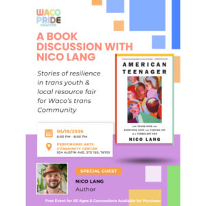 Come meet nonbinary, awarding-winning journalist Nico Lang and discuss their book: “American Teenager: How Trans Kids are Surviving Hate and Finding Joy in a Turbulent Era.” You’ll hear about Nico’s experience traveling the US and documenting the lives of transgender, nonbinary and genderfluid teens and their families and have an opportunity to ask questions. Waco Pride…